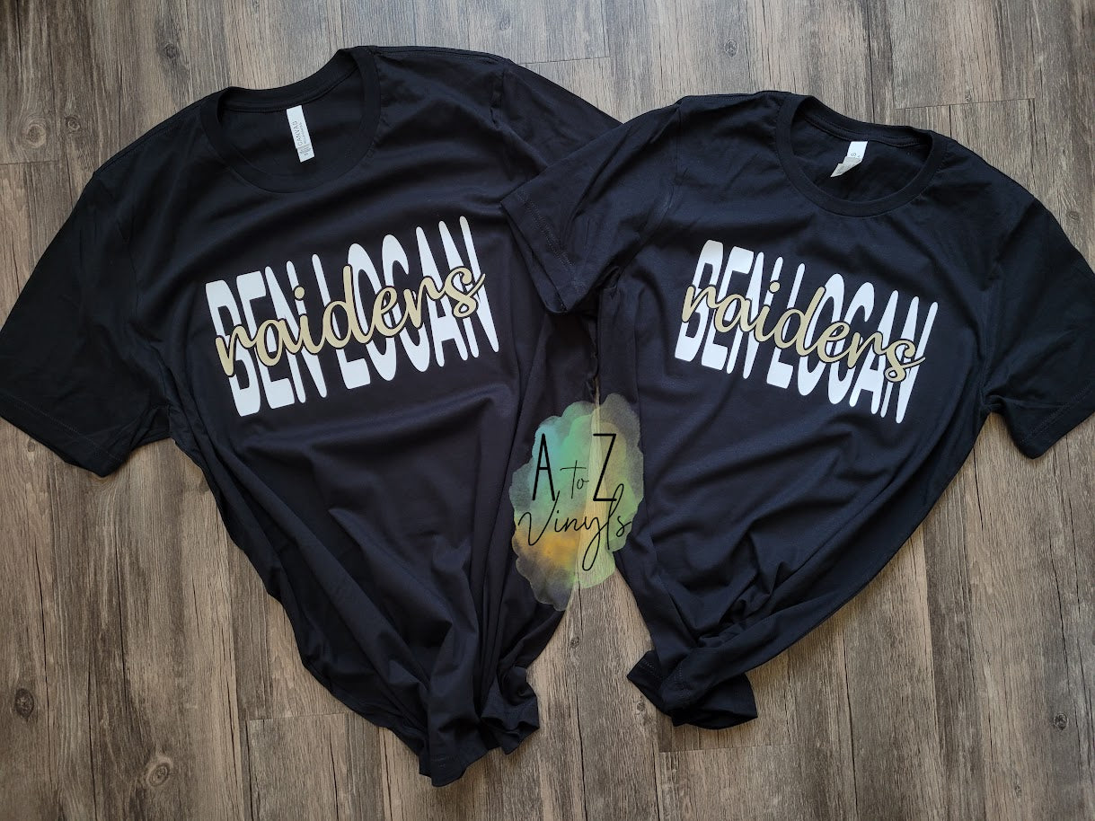 Adult Unisex Bella canvas Black tee- with Ben Logan in white, and "raiders" in Vegas Gold.