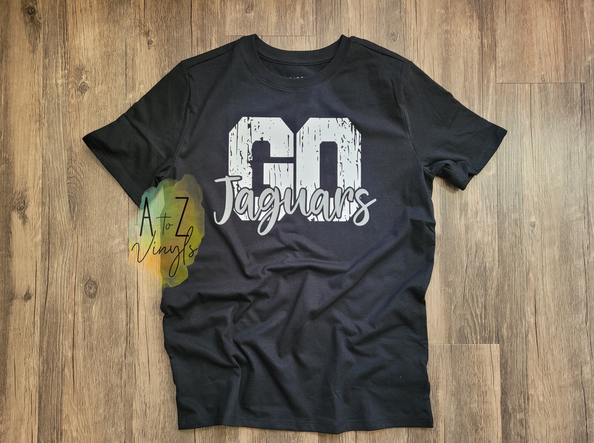 Go is distressed, mad in white. "Jaguars" is in grey