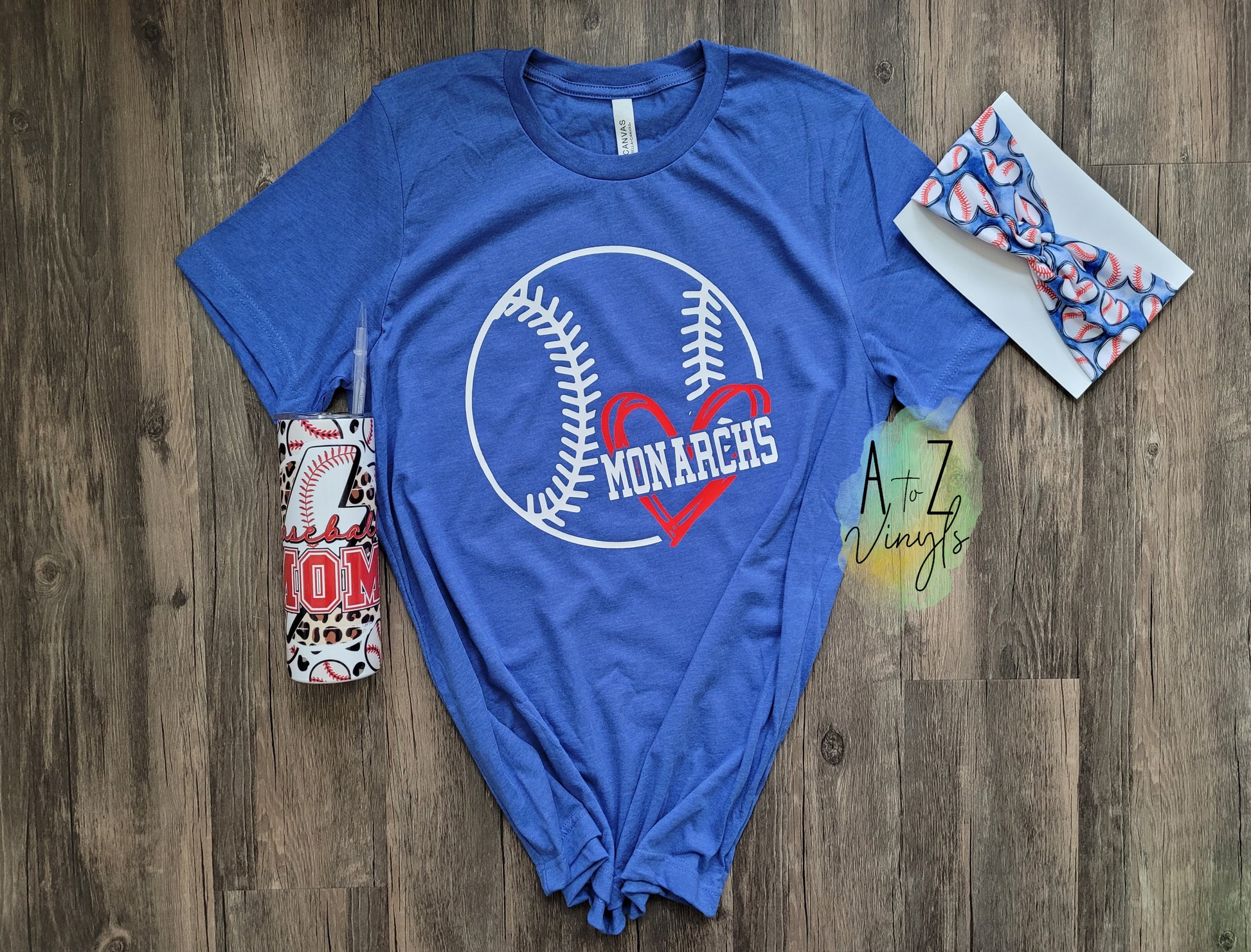 Adult Unisex Bella Canvas heather royal blue tee- Monarchs Baseball heart Design