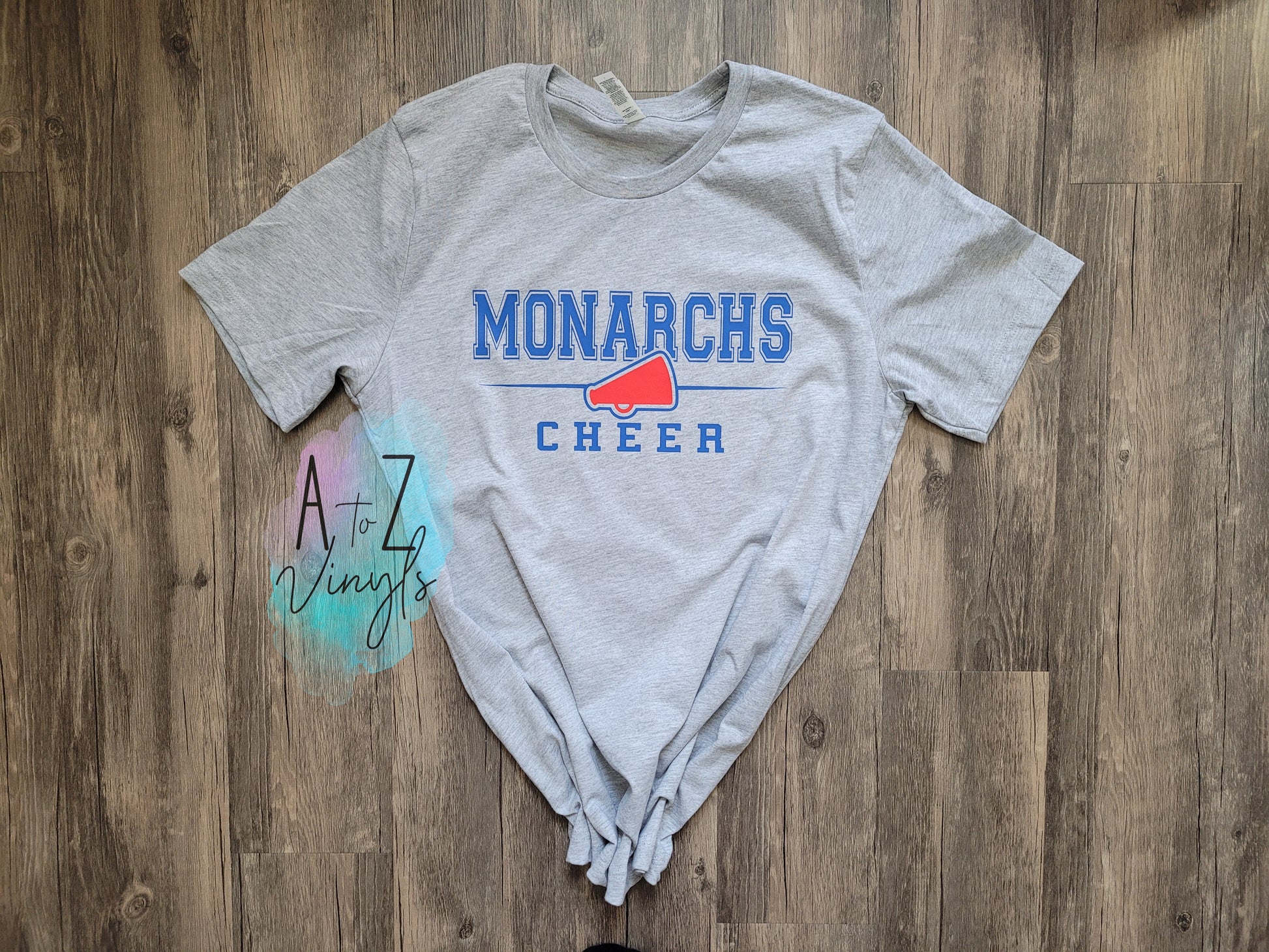 Adult Unisex light Heather Grey- with Monarchs Cheer in royal, and red megaphone