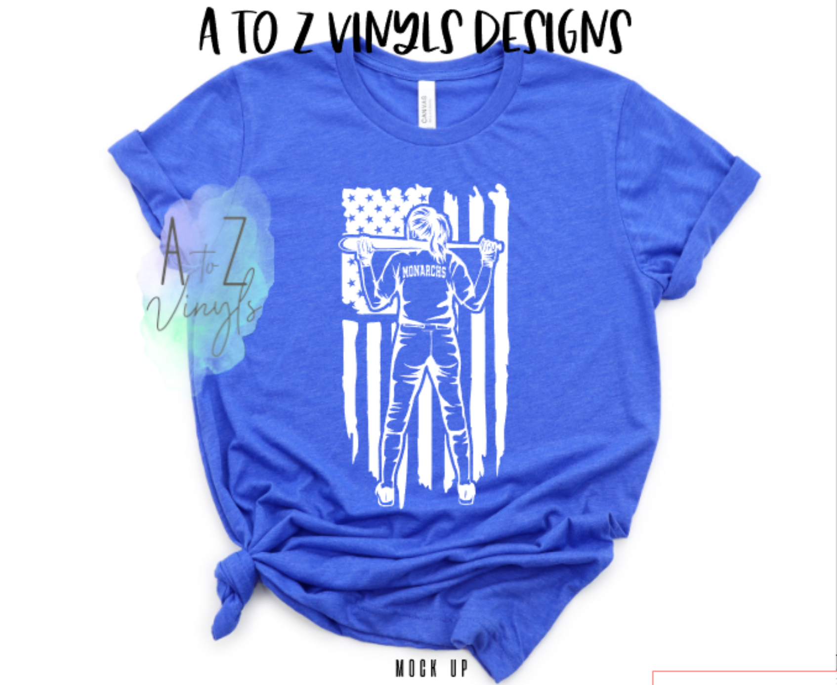 Adult Unisex Bella Canvas Heather royal tee- Softball flag Monarchs Design