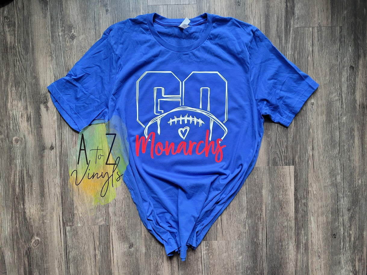 Adult unisex Bella Canvas, royal blue shirt- with Go & football in white, with red "Monarchs"