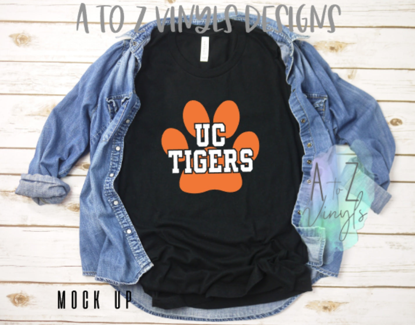 Adult Unisex Bella Canvas Navy or black tee- UC Tigers Bold Paw. white and orange design