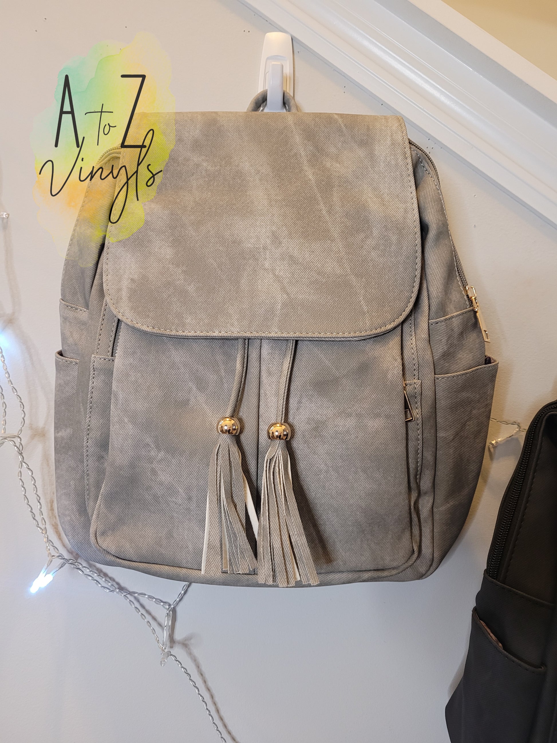 Grey Backpack Purse with small matching clutch. This bag has a faux leather look.