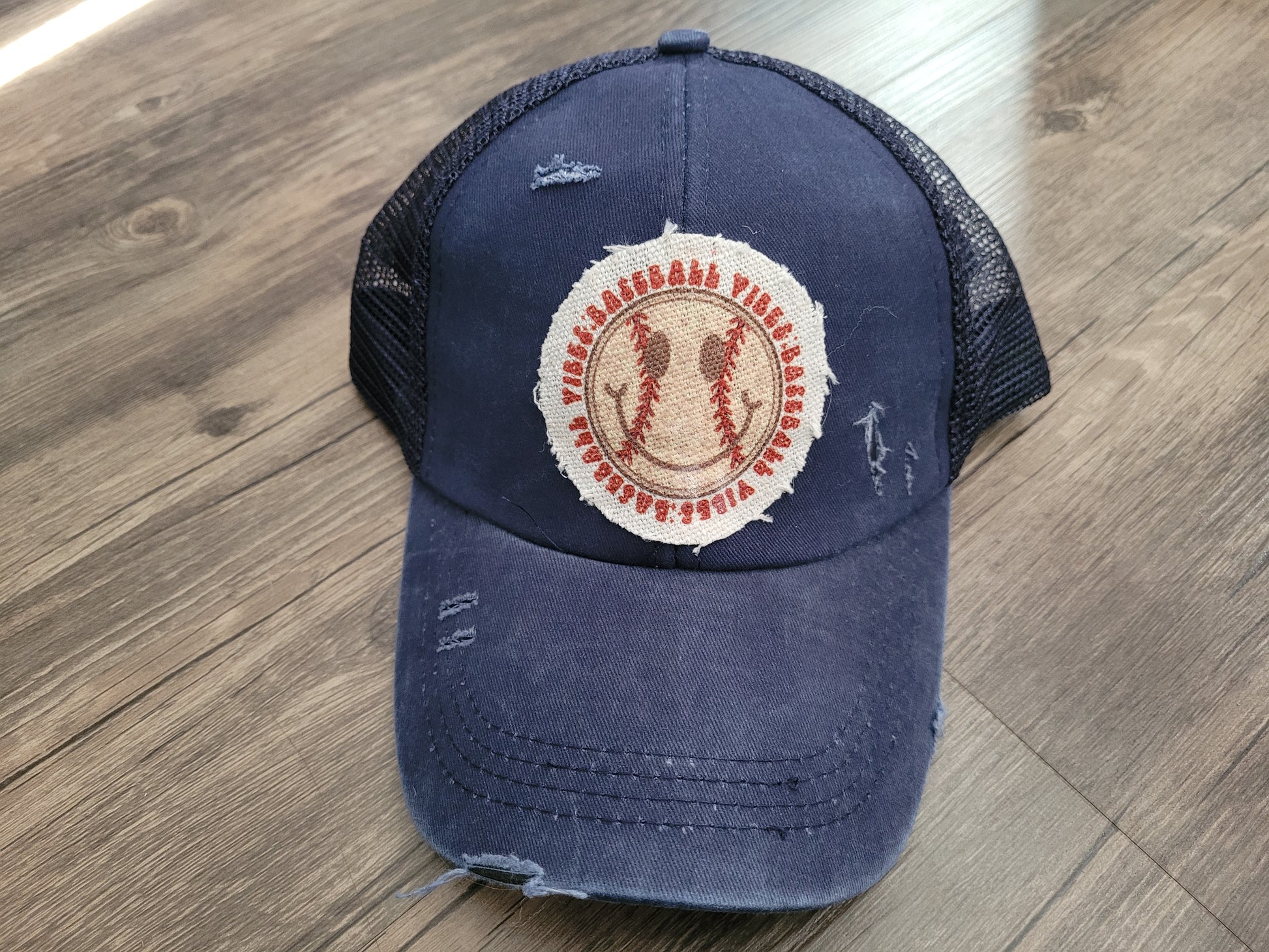 Baseball Vibes Crisscross ponytail adjustable Navy hat.