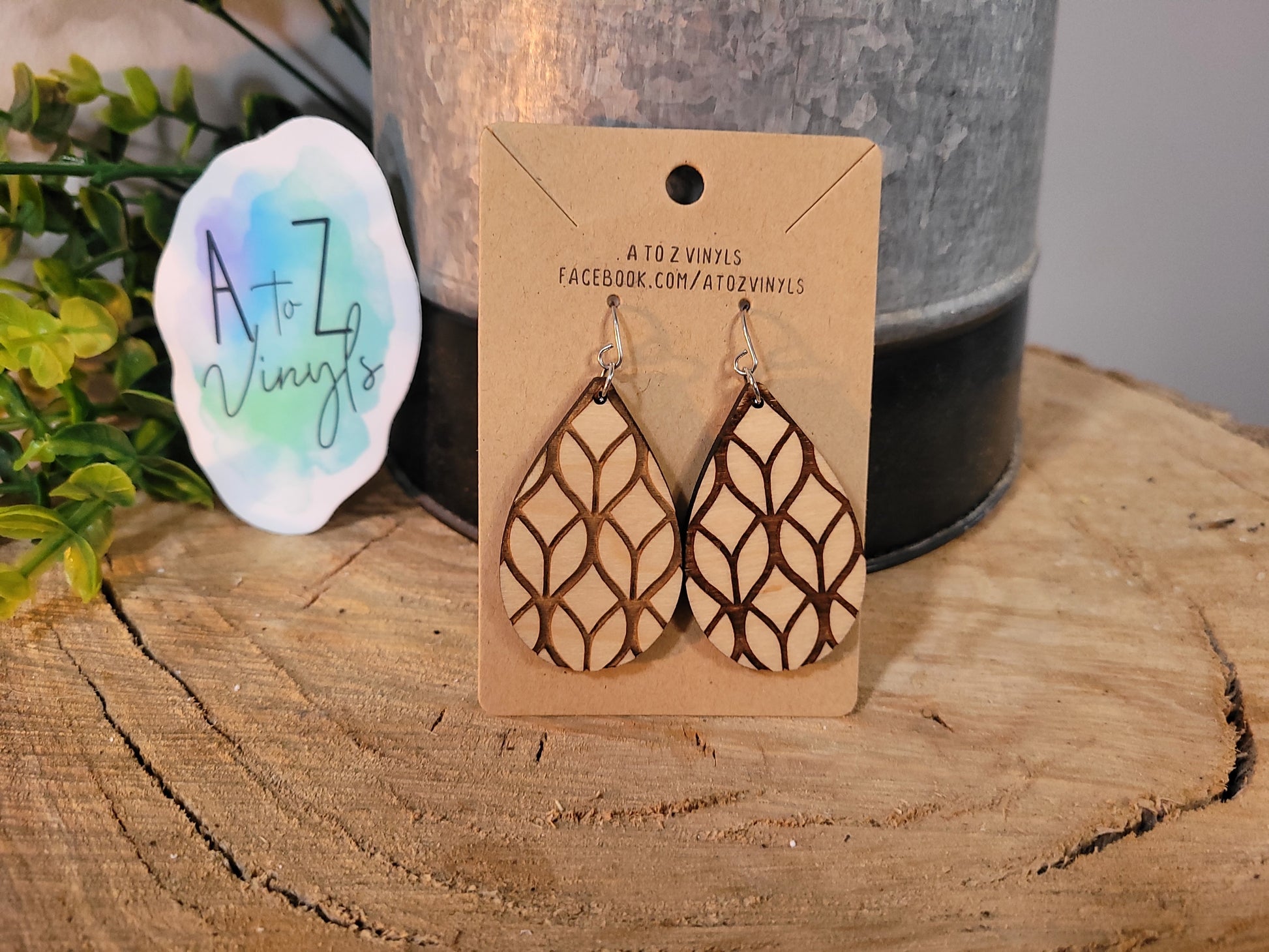 Made of laser engraved maple wood, 2.5” drop length with hypoallergenic stainless steel hook