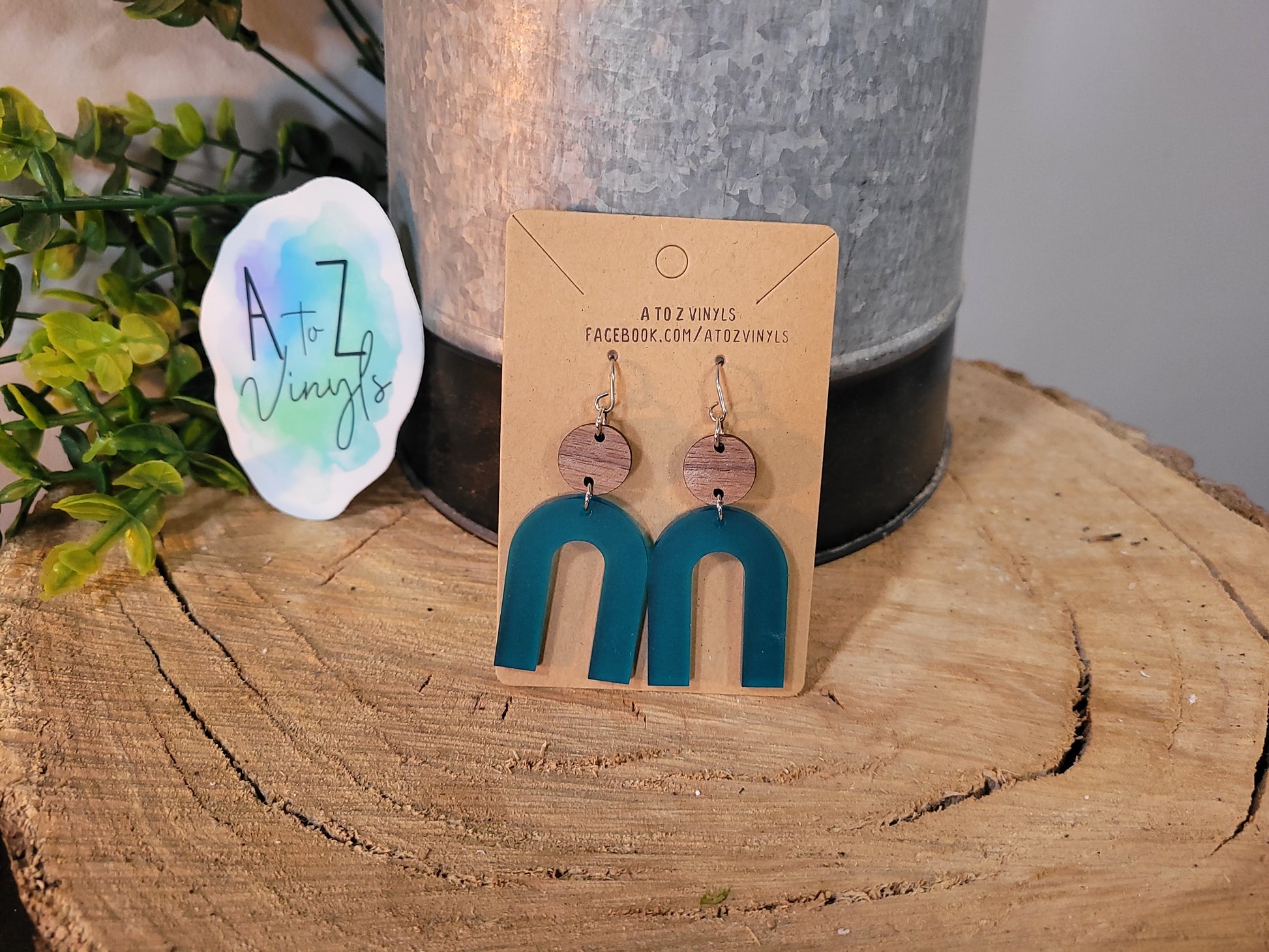 Walnut Circle, teal acrylic arch drops