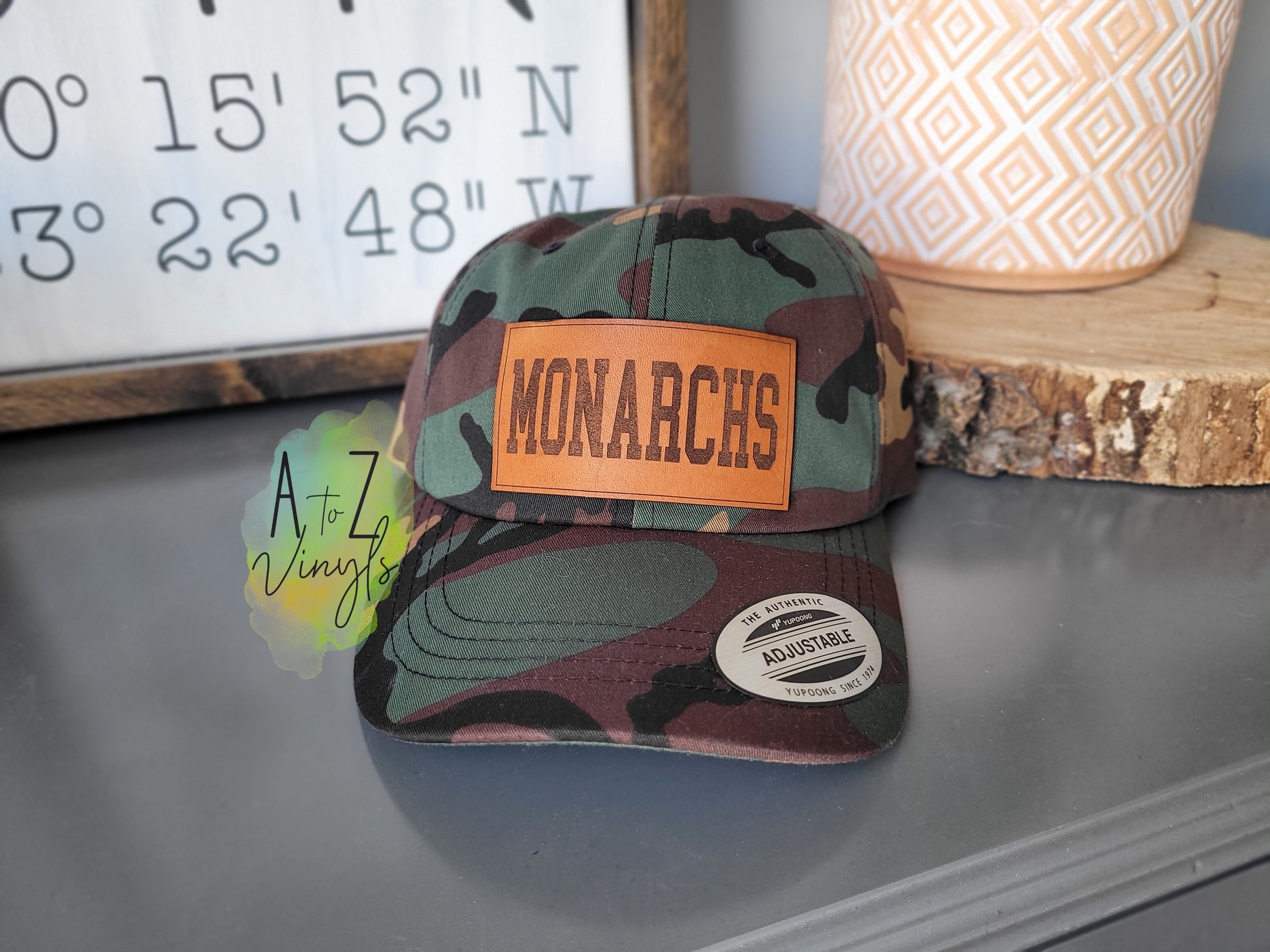 Camo baseball style hat, with Monarchs leather patch