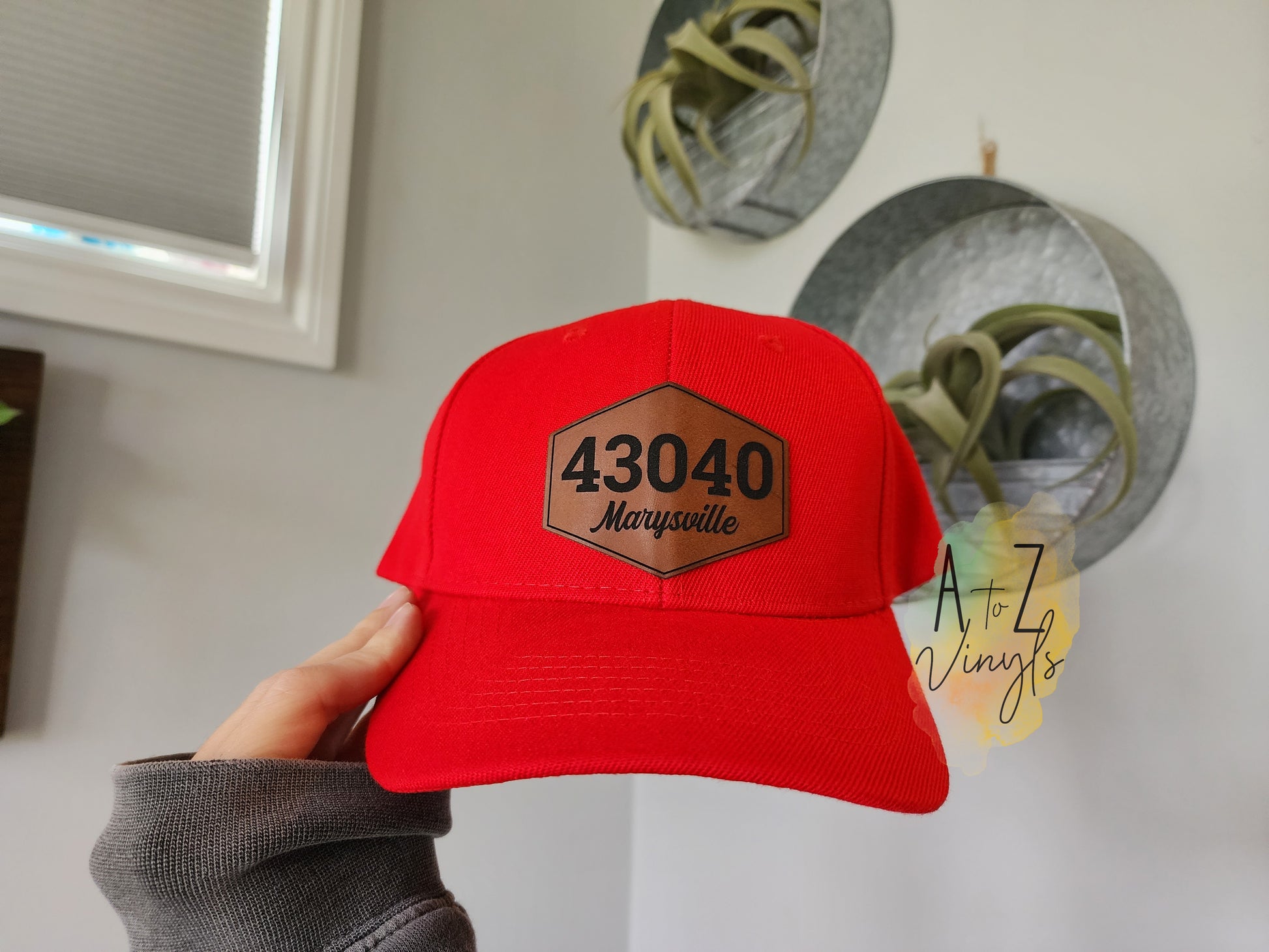 Solid red hat with Velcro adjustable strap, with a 43040 Marysville leatherette patch